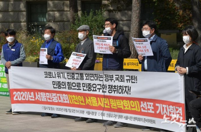 민중요구안 쟁취를 위한 1천인 서울시민 원탁회의 준비위원회가 7일 서울시청 앞에서 2020년 서울민중대회(1천인 서울시민 온라인 원탁회의) 선포 기자회견을 하고 있다.▶ 확 달라진 노컷뉴스