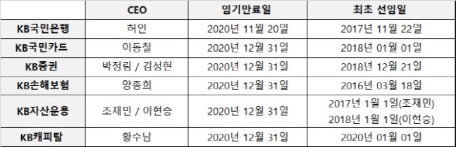 이외 KB국민카드, KB손해보험, KB증권, KB캐피탈, KB자산운용 등 주요 계열사들의 대표이사 임기 만료를 앞두고 있다. KB국민은행보다 한달 늦은 12월 31일까지가 임기다.