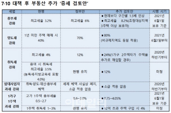 [세종=이데일리 최훈길 기자] 7·10 부동산 대책이 더 세질 전망이다. 여당이 정부안보다 종합부동산세, 양도소득세, 취득세를 높이는 방안을 검토하고 있어서다. 다주택자뿐 아니라 서울 강남 등에 소위 ‘똘똘한 한 채’를 가지고 있는 1주택자의 세 부담도 늘어날 전망이다. 야당은 반시장적 꼼수 증세라며 부동산 감세를 촉구하고 나서 국회 심의 과정에서 진통이 불가피할 전망이다.
